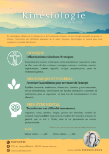 La kinésiologie est une thérapie manuelle issue de la chiropraxie (proche de l'ostéopathie) qui s’attache au bien-être global de la personne. Elle prend en compte l'interaction des différents domaines : physique, biochimique et émotionnel. Elle prend donc en compte chacunes de ces composantes qui intéragissent entre elles pour évacuer les différentes lésions en jeu en cas de symptômes, inconfort physique et/ou émotionnel. On se sert de points d'acupressions et autres points réflexes pour rétablir le système défaillant en douceur et durablement. Pour toutes séances, nous allons vérifier le bon fonctionnement de tout ce qui est musculo-squelettique, viscéral, émotionnel et énergétique. J'utilise d'autres méthodes complémentaires comme l'ostéothérapie (issue de la méthode Poyet) et le Niromathé pour toutes douleurs physiques et troubles fonctionnels.